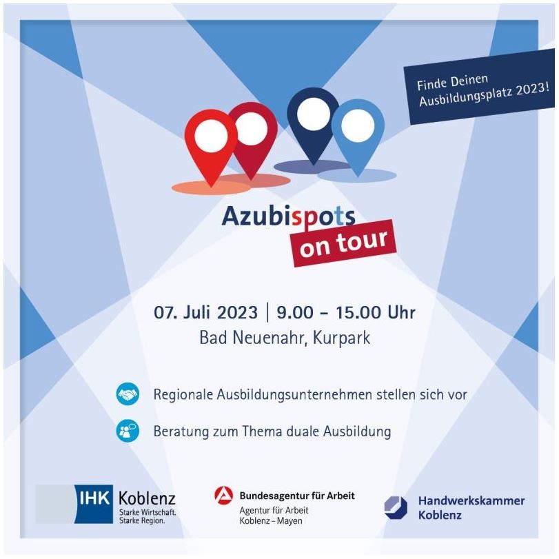 Die Azubispots mit Unternehmermeile als gemeinsame Veranstaltung der Agentur für Arbeit Koblenz-Mayen, der Industrie- und Handelskammer Koblenz und der Handwerkskammer Koblenz kommen am 07. Juli in den Kurpark in Bad Neuenahr-Ahrweiler. Im Rahmen einer großen Freiluftmesse, die von 9:00-15:00 Uhr stattfindet, können Betriebe und potenzieller Nachwuchs einander kennenlernen. Eingeladen sind alle Schülerinnen und Schüler, die bald die Schule verlassen, auf der Suche nach einem Ausbildungsplatz sind oder sich über Berufe informieren möchten. Auch ihre Eltern, Lehrende oder Vertrauenspersonen sind herzlich willkommen. Die Teilnahme ist kostenlos.